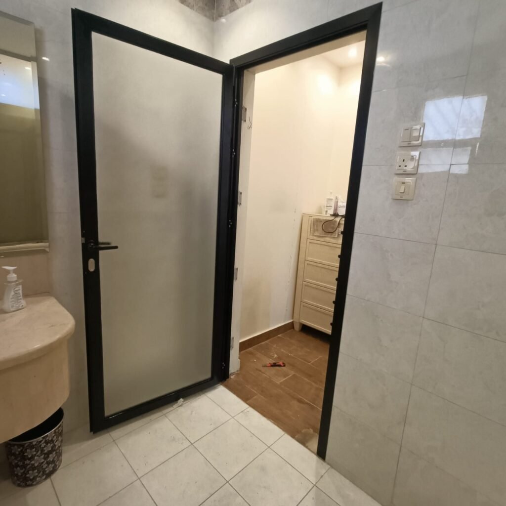 تم تركيب باب ألومنيوم مخصص للحمام في فيلا سكنية، بتصميم موفّر للمساحة ومقاوم للماء والرطوبة، مع لمسة أنيقة وعملية.